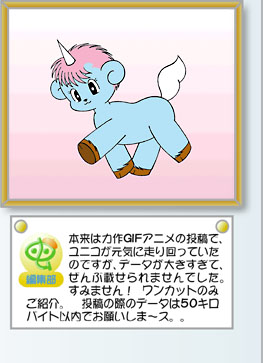 ゆめやん さん↓ ユニコのぬいぐるみを、デジカメで撮ったのを少し加工して、gifアニメで動き だすようにしました。(動かない物をアニメで動かすのも、手塚先生のアニメの テーマのひとつでしたよね。)大変だったけど、とても楽しかったです〜♪^v^ |