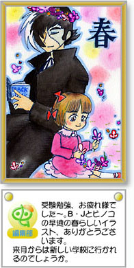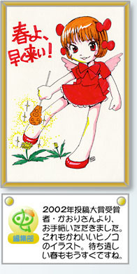 かおり さん↓ ドジッコキャットさん、ikusinさんをはじめ、投票してくださった方々、ありがとうございました。感謝をこめて…みなさんにはやく春が来ますように、ピノコ春の妖精です(笑) ヒョウタンツギ18さんのイラストは、12月に掲載されていた時から、上手でインパクトあって、すごいなーっと思っていたので、ヒョウタンツギ18さんと並んで大賞がとれてとてもうれしいです。 これからもがんばって投稿したいですねvv ![]() |