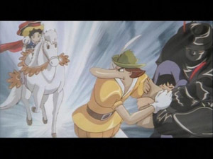 京都の駅ビルの中にあった手塚治虫ワールド(2011年1月16日閉館)の中に300インチシアターという劇場があり、そこで上映されていたオリジナル短編アニメ。手塚漫画の代表作の、そのエッセンスを詰め込んだアニメーション作品と、京都にまつわる歴史的なエピソードを紹介するアニメーションとの二本立てという形で上映され、その二本を火の鳥がストーリー・テラーとなってつないで行く、という構成です。 火の鳥は「平和な世界を夢見ながらも、過酷な運命に翻弄される人間たち」の象徴として手塚漫画の中から『リボンの騎士』を選んで紹介します。天使の間違いから女の子の体の中に男の子の心を入れられてしまったサファイヤ。男の子しか王位継承権を得られない国でサファイヤは女の子であることを隠し、王子として育てられます。けれど国の支配権を奪おうと企んでいるジュラルミン大公一派はサファイヤがじつは女の子だと見ぬき、それを公にして国民を騙した王を追放しようと画策しています。平和でおだやかな世界を夢見ながら、悪意に満ちた陰謀に立ちはだかられ、それでもなお「明日」を信じ続けるサファイヤの姿。火の鳥はそこに「希望を失わない限り、けっして世界から光は失われない」ことを伝えようとします。サファイヤのように平和を望みながらも陰謀によって戦いの渦中に巻きこまれて行った人物として、京都の歴史にその名を残す源義経を振り返ります。義経がまだ牛若丸と呼ばれていた頃に敵として出会い、その後、生涯の相棒として義経を守った弁慶という名の豪傑の物語。この有名なエピソードを手塚治虫のマンガ『弁慶』からキャラクターを引用しながら語っていきます。実の兄に嫉妬され、命を狙われる運命に「何故だ!」と問いかける義経の姿が胸に迫ります。