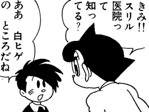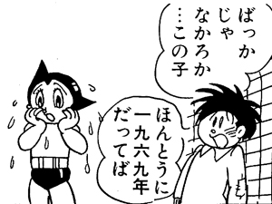 一人、過去の世界に放り出されたアトムは途方にくれますが、同じく行き先も、知り合い一人いないスカラとともに、奇妙な共同生活を始めることに。エネルギー補充機が開発されていないため、エネルギーの補充もできず、ロボットの友達もいない過去の地球で、アトムはヒゲオヤジのゆかりの人物・スリル医師と、若き日の御茶ノ水博士に出会います。